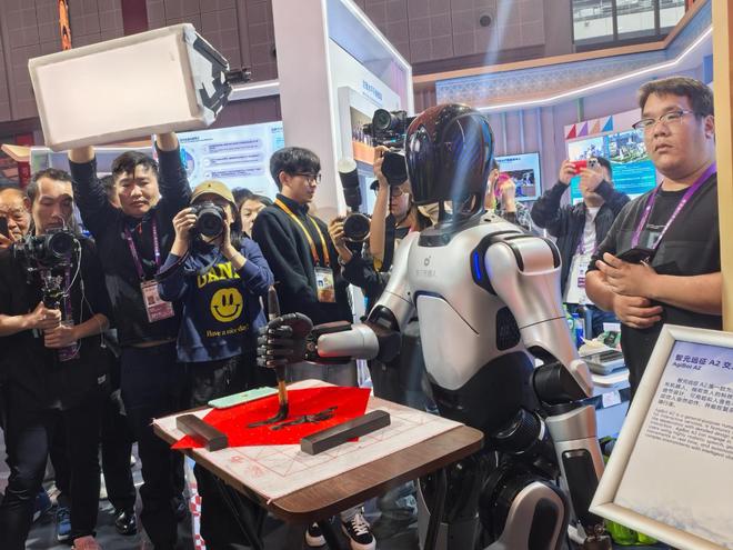 中国国家展上的“智元远征”机器人表演写书法。(中国商报记者 于佳鑫/摄)