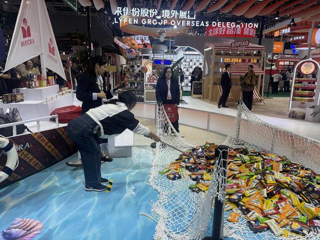 进博会农食产品展区,消费者互动体验在“打捞”食品。(中国商报记者 周子荑/摄)