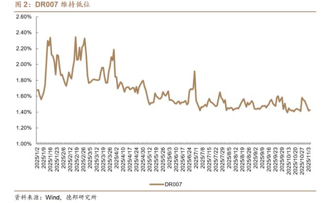 央行资金面维持净回笼,资金利率稳定。今日央行开展655亿元7天期逆回购操作,操作利率维持1.40%不变,当日有5577亿元逆回购到期,实现净回笼4922亿元。尽管回笼规模较大,但市场流动性仍显充裕,短端资金利率平稳。从近期趋势看,9月以来DR007整体运行在1.4%附近的相对低位。上海银行间同业拆放利率(Shibor)显示,隔夜Shibor持平于1.315%,7天期微升0.8BP至1.423%,14天期下行1.7BP至1.461%,1个月期下行0.45BP至1.5415%。