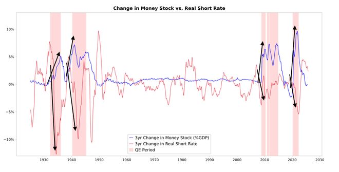 达利欧认为,由于财政政策高度刺激——巨额债务存量和赤字通过大规模国债发行融资,QE实际上是在货币化政府债务而非单纯为私人部门提供流动性。