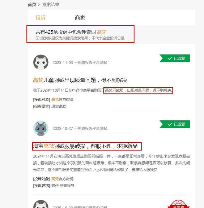 在黑猫平台,包含高梵的搜索词有425条,其中不乏与产品质量和售后服务直接相关的投诉,另有线上消费者评价显示,高梵部分产品存在面料薄、跑绒、开线等问题。高端定位若缺乏与之匹配的品质&售后水平支撑,口碑的崩塌或只是时间早晚。