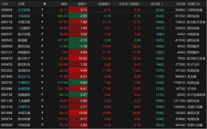 市场赚钱效应不错,4108只个股收涨,涨停股143只;1222只个股收跌,跌停股2只。20只个股日成交额超过100亿元,东方财富今日收涨5.73%报25.11元/股,日成交额224亿元;中际旭创跌近3%报605.25元/股,日成交额202亿元。中国卫星收涨7.6%,航天电子、金风科技、中国卫通涨停。