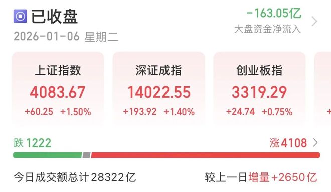 1月6日,A股续写“开门红”,沪指实现13连阳,日成交突破2.8万亿元,指数、板块、个股全线飘红,4108只个股收红,有色金属、电子、计算机、基础化工、国防军工领涨。