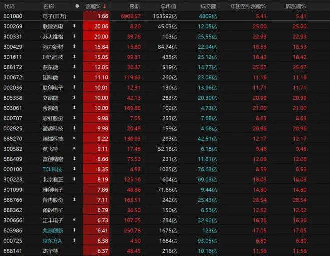 9只电子股涨停,联建光电、苏大维格“20cm”涨停,联创电子、立昂微、金海通均涨停。