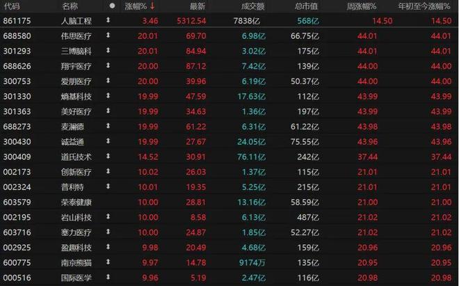人脑工程概念股继续火爆,伟思医疗、三博脑科、翔宇医疗、爱朋医疗、美好医疗等17只相关个股涨停。