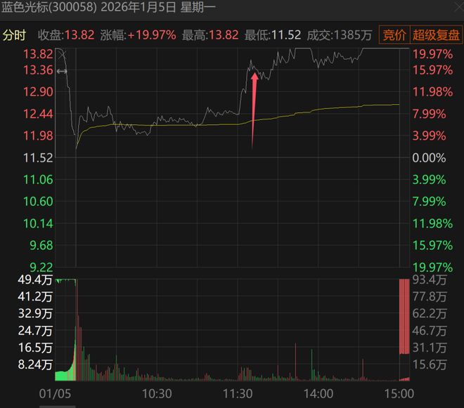注意,这篇文章是13点16分发布的,如下图箭头处所示,在这不久后,蓝色光标就拉升至涨停板。