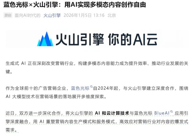 1月5日下午,在蓝色光标股价暴涨的同时,火山引擎公众号发布标题为《蓝色光标×火山引擎:用AI实现多模态内容创作自由》的文章,称“作为全球前十的广告营销企业,蓝色光标自2024年起,与火山引擎建立深度合作,围绕AI大模型技术在营销场景的落地展开多维度探索。近日,双方进一步深化合作,将火山引擎的AI和云计算技术与蓝色光标BlueAI应用引擎深度融合,用AI重塑营销内容生产模式和服务模式,高效应对营销行业对内容的爆发式需求。”