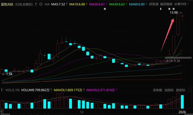 2025年12月30日,蓝色光标放量大涨超过7%,31日20cm大号涨停。1月5日,元旦假期结束之后第一个工作日,蓝色光标再度走出20cm大号涨停板。