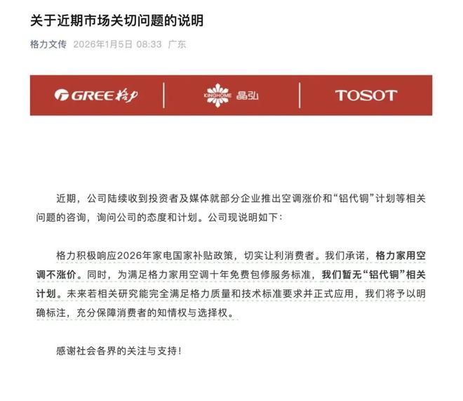 1月5日,格力官微「格力文传」发布说明称,近期公司收到多方关于部分企业上调空调价格及推进「铝代铜」方案的询问。格力表示,将积极响应今年家电国家补贴政策,继续让利消费者,并承诺格力家用空调价格保持稳定。在材料使用方面,格力强调,为满足家用空调十年免费包修服务标准,公司目前不会采用「铝代铜」方案。