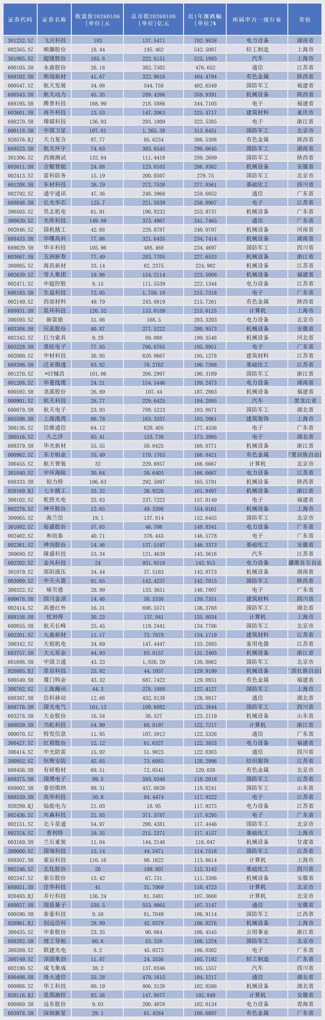 其中,飞沃科技、顺灏股份、超捷股份、永鼎股份、斯瑞新材、航天发展、航天动力、腾景科技、再升科技、臻镭科技、中国卫星、天力复合、航天环宇、西测测试、合锻智能、雷科防务、东材科技、通宇通讯、长光华芯、昊志机电、光库科技、国机精工、华曙高科、华丰科技、五洲新春、海昌新材、雪人集团、中超控股、生益科技、西部材料、星环科技、新雷能、应流股份等33家公司股价累计涨幅超过200%。