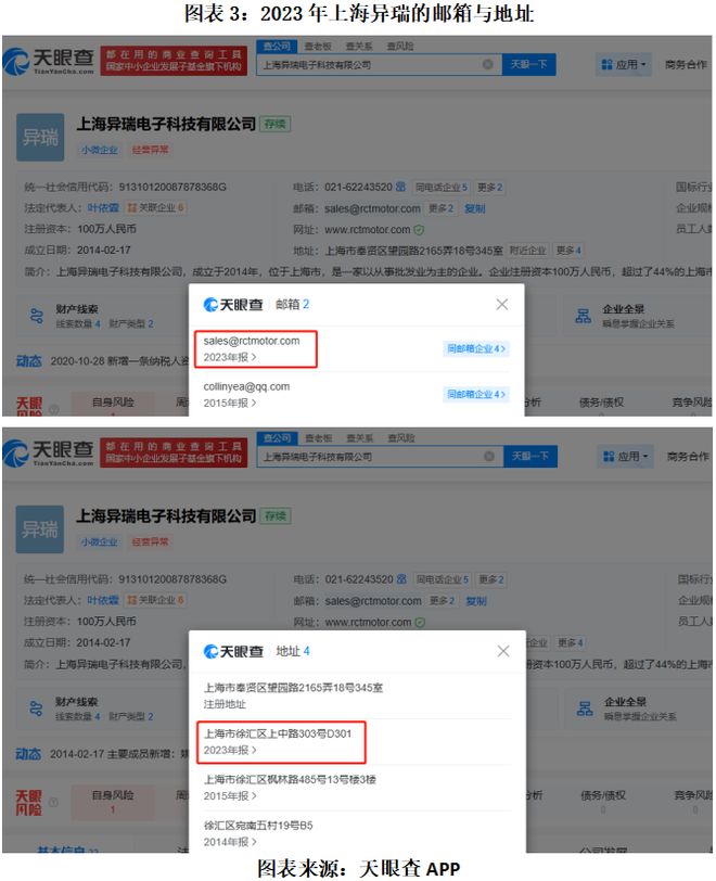 招股书显示,上海悬拓与上海异瑞电子科技有限公司(下称“上海异瑞”)属同一控制下的关联客户,合并列示为上海悬拓。天眼查APP显示,2023年年报显示,上海异瑞的地址为“上海市徐汇区上中路303号D301”,邮箱为“sales@rctmotor.com”。