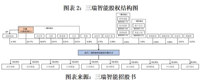 截至招股书签署日(2025年12月17日),48岁的吴敏直接持有三瑞智能43.17%的股份,并通过瑞博投资控制该公司4.19%股份的表决权。此外,吴敏的表弟万志坚、表弟万凯、妹夫熊承想及堂弟吴杰分别持有三瑞智能18.67%、5.01%、5.01%、5.01%股份的表决权,合计持有33.70%股份的表决权。上述亲属是吴敏的一致行动人,因此吴敏合计控制该公司81.06%的表决权。