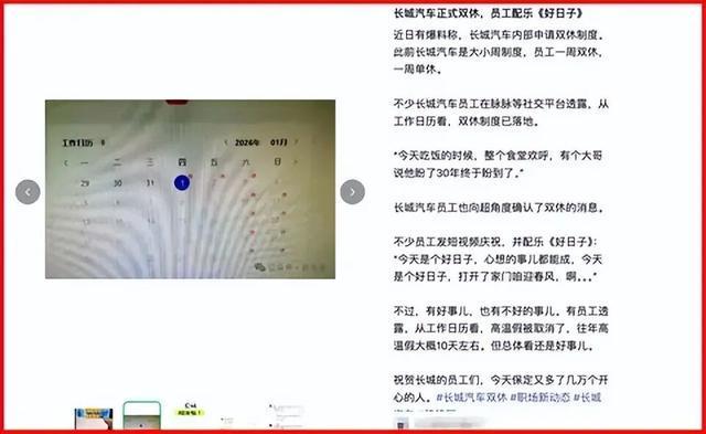 2026年初的一个午餐时段,保定长城汽车的食堂突然沸腾,欢呼声此起彼伏。一位老员工举着手机不停刷新,屏幕上2026年工作日历里“周末双休”的标注格外醒目,他红着眼眶念叨:“盼了30年,终于等到这一天了。”这一幕的背后,是长城汽车正式取消大小周、全面落实双休制度的消息尘埃落定——对这座有着周六上班传统的城市而言,这则消息远比午餐的热菜更让人振奋。