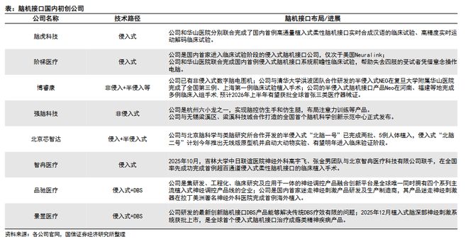 在侵入式与半侵入式领域,国内企业正密集开展临床试验。据国信证券梳理,阶梯医疗与华山医院合作,完成了国内首例侵入式脑机接口系统的前瞻性临床试验,受试者可通过意念控制鼠标;脑虎科技也完成了首例高通量柔性脑机接口实时合成汉语的临床试验。博睿康的半侵入式产品NEO预计将于2026年上半年获批全球首张三类医疗器械证。此外,心玮医疗与南开大学合作布局介入式技术,计划于2026年底完成首例人体植入。