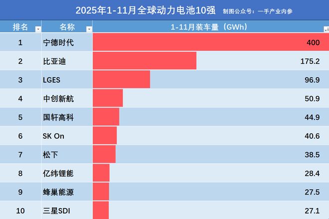 另附:2025年1-11月全球动力电池装车量10强厂商,数据源于:SNE Research