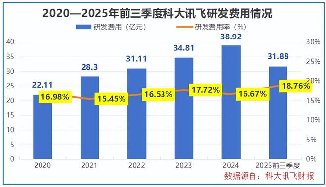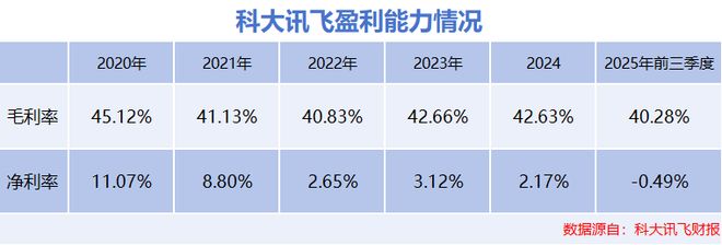 数据显示,2020-2025年前三季度,科大讯飞的毛利率一直在40%以上,这一水平在行业内并不算低,可见其业务本身具备一定的盈利基础。