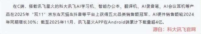 官网显示,在2025年“双11”期间,科大讯飞的AI学习机、智能办公本等五大品类产品,在京东、天猫、抖音等主流平台斩获销售冠军,AI硬件销售额较2024年同期增长30%。