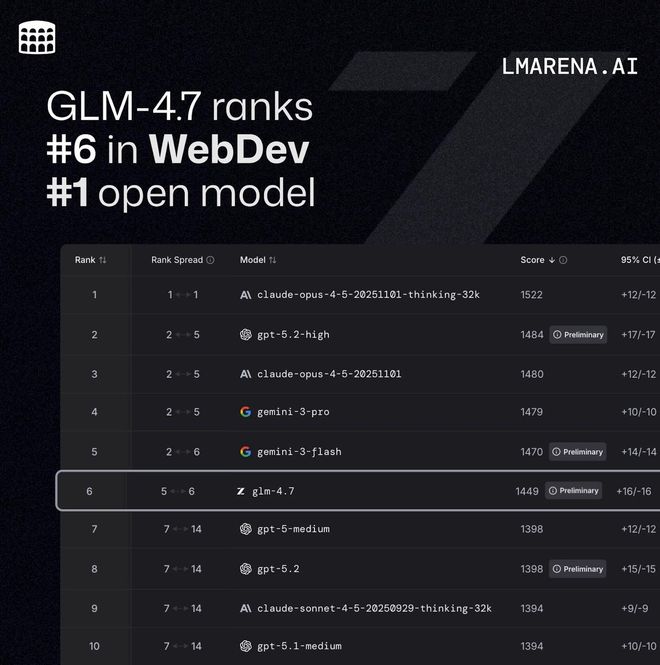 另外,在全球百万用户盲测的Code Arena(代码竞技场)上,GLM-4.7位列全球开源第一、国内第一,超过了GPT-5.2。