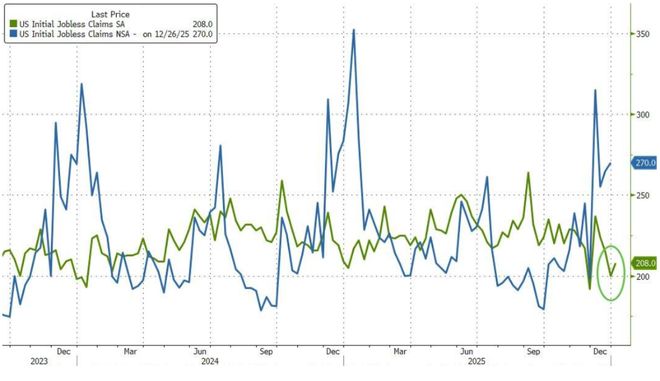 1月8日,美国劳工部公布数据显示,截至1月3日当周,美国首次申请失业救济人数为20.8万人。该数据虽较前值19.9万人小幅回升,但仍低于市场预期的21.2万人,继续处于历史低位区间。
