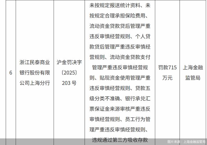 开年重罚的落地,让民泰银行的合规问题被置于聚光灯下。1月12日,上海金融监管局公布了对多家银行的处罚信息,其中,民泰银行上海分行的罚单尤为醒目,715万元的罚款金额、多达十项的违规事由,剑指该行业务链条上的"失守"。