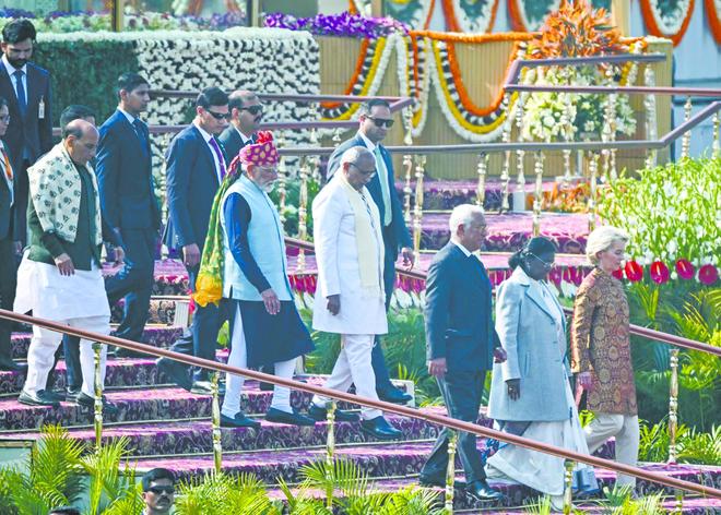 26日,印度总理莫迪(前排左二)、欧洲理事会主席科斯塔(右三)、欧盟委员会主席冯德莱恩(右一)出席印度“共和国日”庆祝活动。(视觉中国)